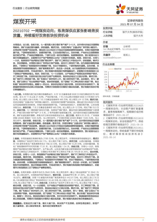 【天风证券】【20210704】20210704-天风证券-煤炭开采:一周煤炭动向:炼焦煤供应紧张影响焦炭放量,持续看好双焦板块投资机会-19页