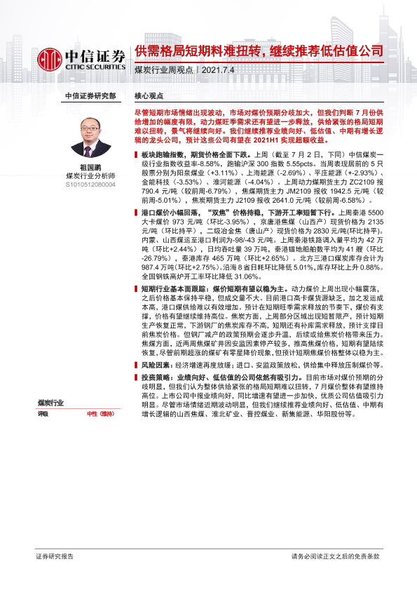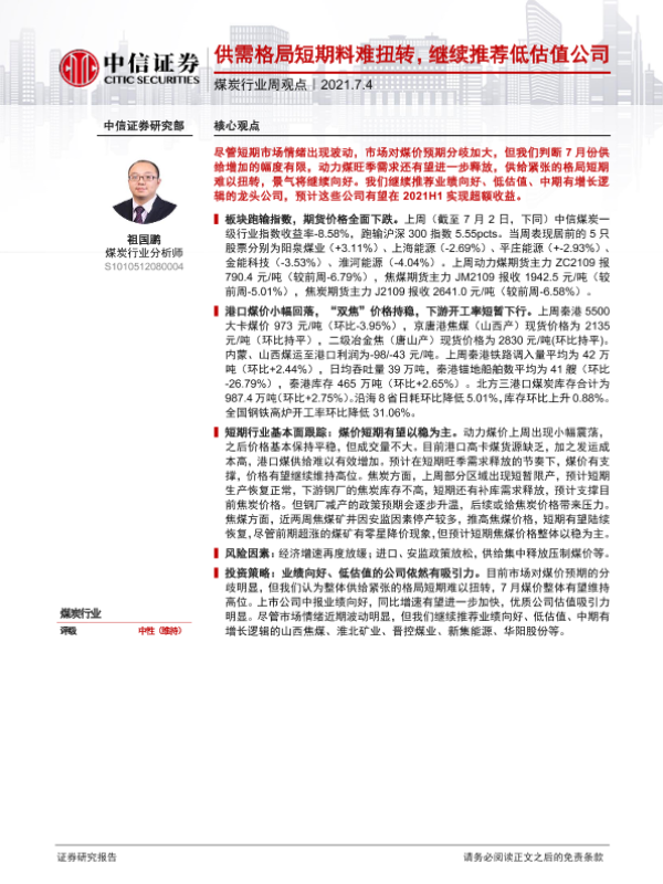 【中信证券】【20210704】20210704-中信证券-煤炭行业周观点:供需格局短期料难扭转,继续推荐低估值公司-7页