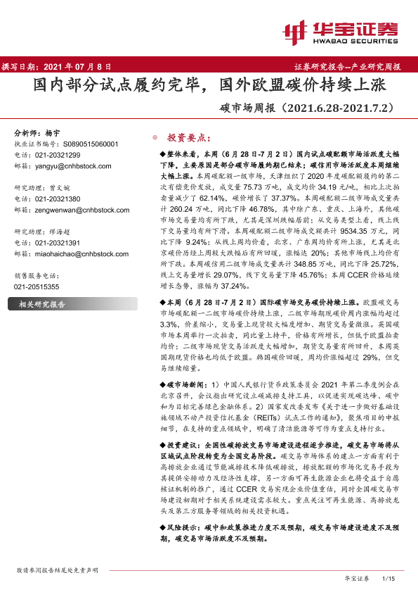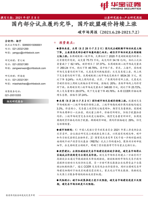 【华宝证券】【20210708】20210708-华宝证券-碳市场周报:国内部分试点履约完毕,国外欧盟碳价持续上涨-15页