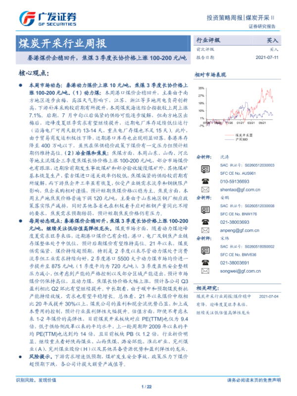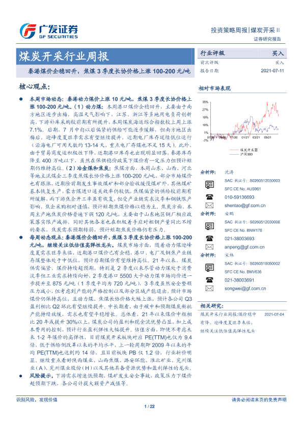 【广发证券】【20210711】20210711-广发证券-煤炭开采行业周报:秦港煤价企稳回升,焦煤3季度长协价格上涨100-200元 吨-22页