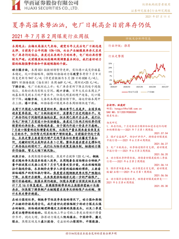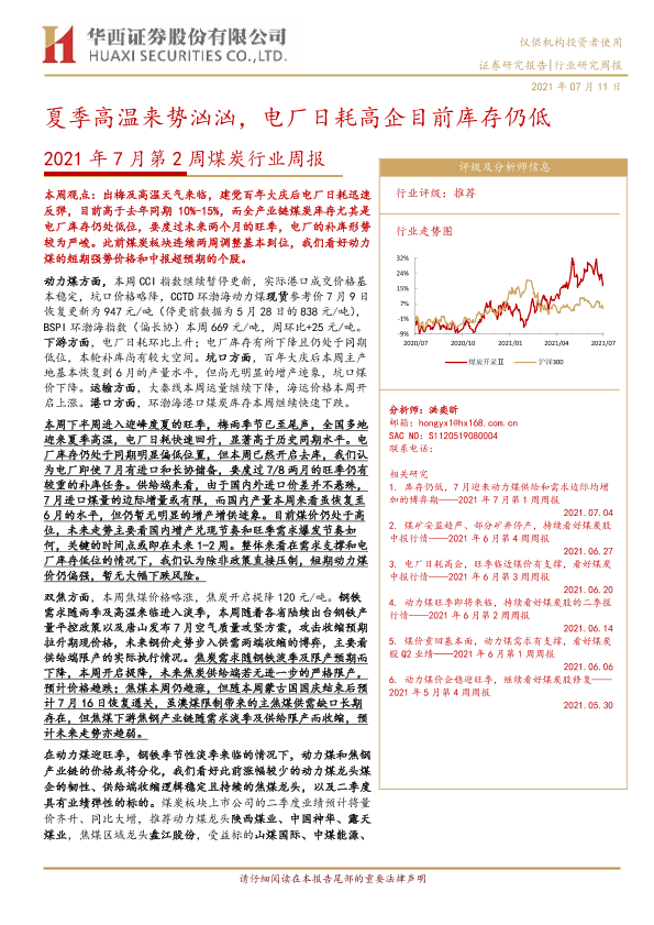 【华西证券】【20210711】2021年7月第2周煤炭行业周报:夏季高温来势汹汹,电厂日耗高企目前库存仍低-23页