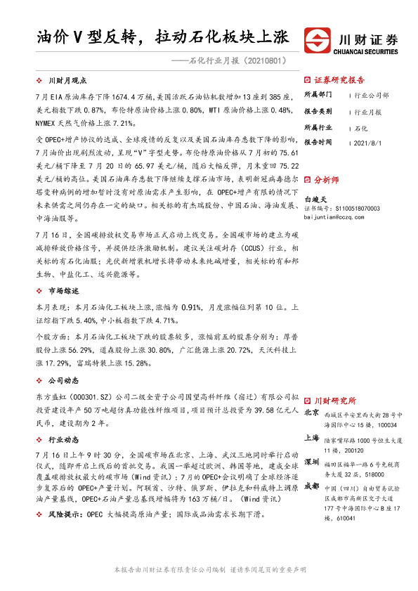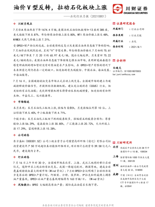 【川财证券】【20210801】20210801-川财证券-石化行业月报:油价V型反转,拉动石化板块上涨-12页