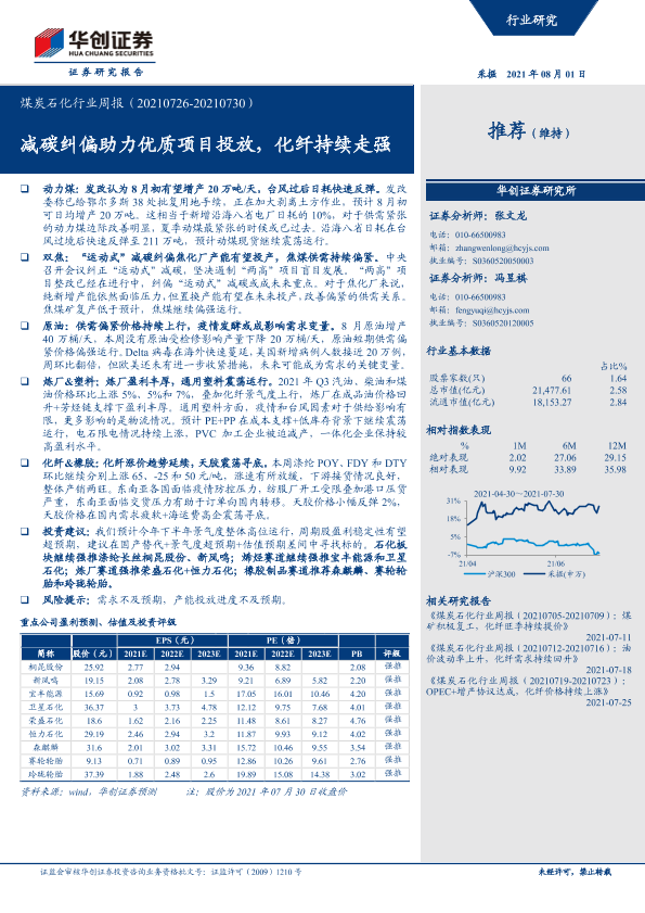 【华创证券】【20210801】煤炭石化行业周报:减碳纠偏助力优质项目投放,化纤持续走强-19页