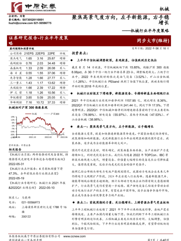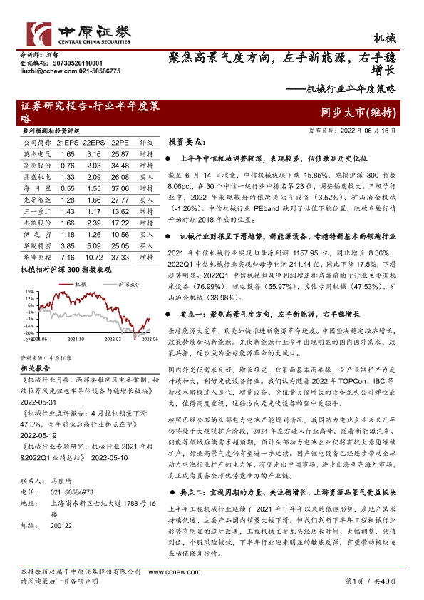 【中原证券】【20220616】机械行业半年度策略:聚焦高景气度方向,左手新能源,右手稳增长-40页