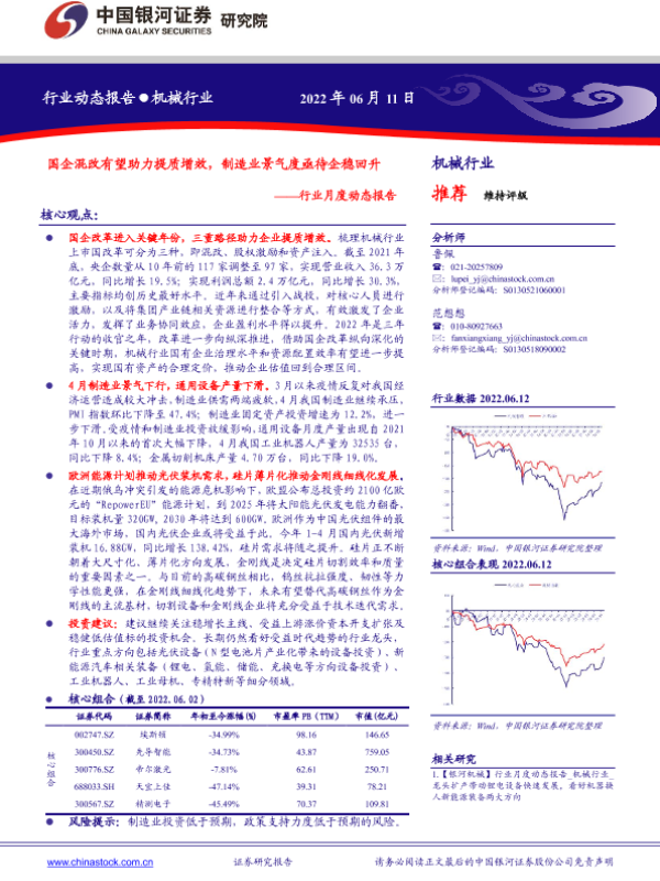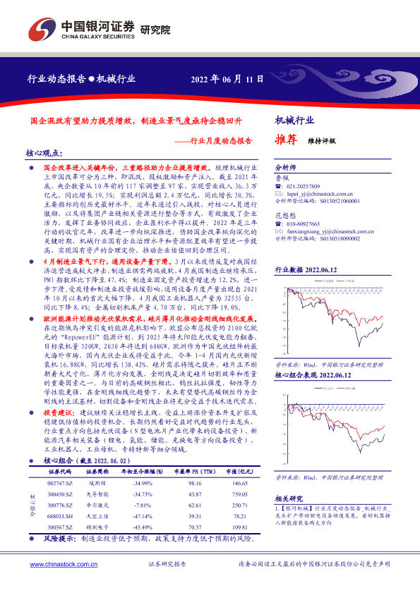 【银河证券】【20220611】机械行业月度动态报告:国企混改有望助力提质增效,制造业景气度亟待企稳回升-29页