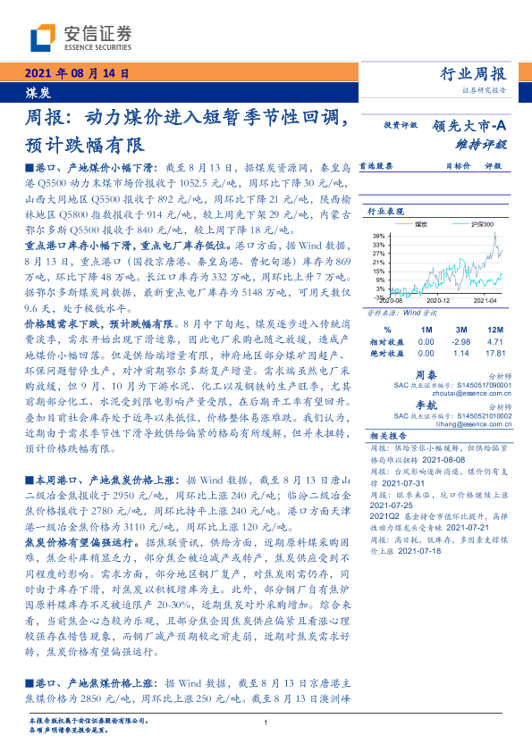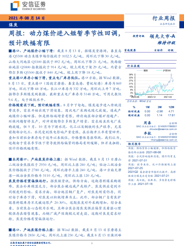 【安信证券】【20210814】20210814-安信证券-煤炭周报:动力煤价进入短暂季节性回调,预计跌幅有限-23页