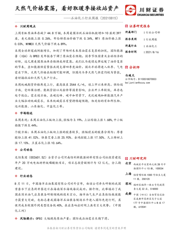 【川财证券】【20210816】20210816-川财证券-石油化工行业周报:天然气价格震荡,看好取暖季接收站资产-12页