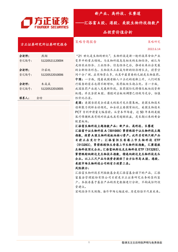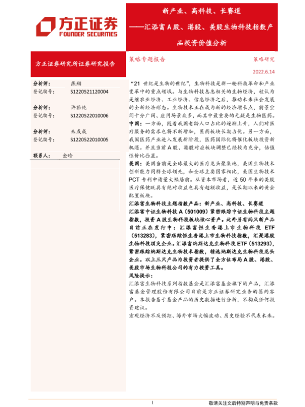 【方正证券】【20220614】汇添富A股、港股、美股生物科技指数产品投资价值分析:新产业、高科技、长赛道-27页