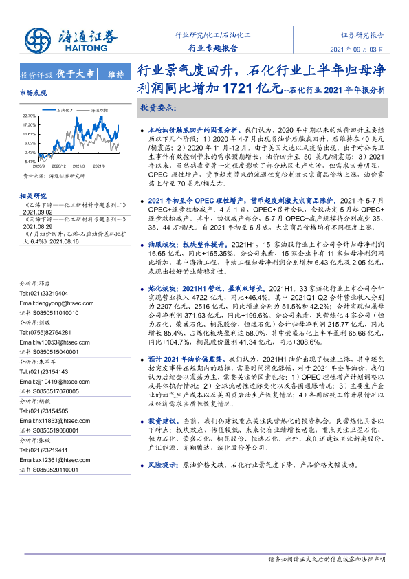 【海通证券】【20210903】石化行业2021半年报分析:行业景气度回升,石化行业上半年归母净利润同比增加1721亿元-23页