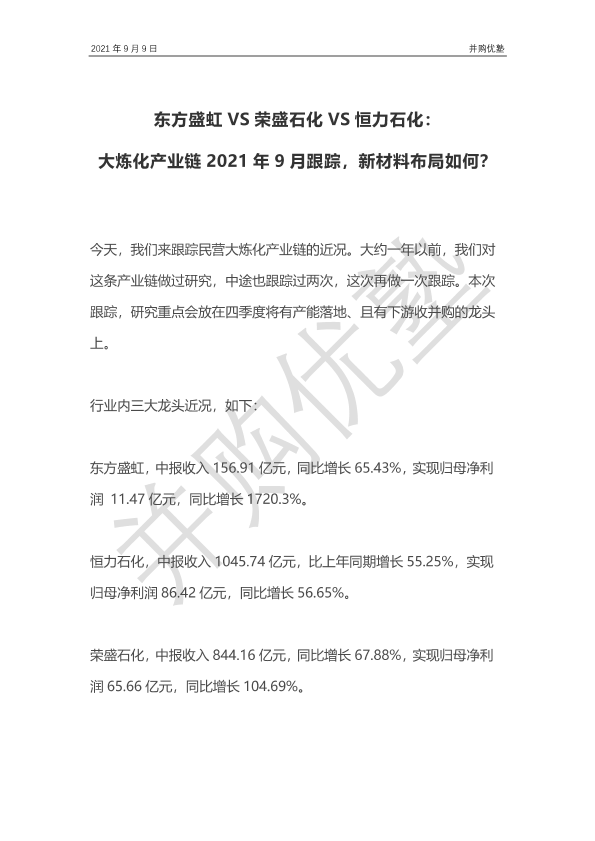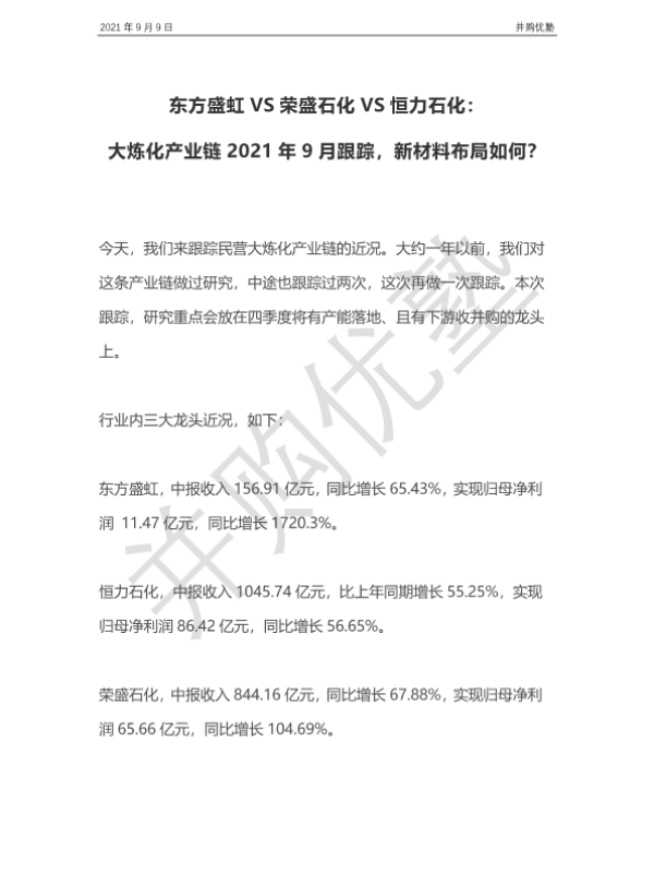 【并购优塾】【20210909】东方盛虹VS荣盛石化VS恒力石化:大炼化产业链2021年9月跟踪,新材料布局如何?-25页