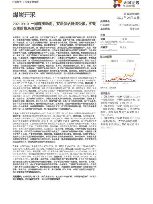 【天风证券】【20210911】20210911-天风证券-一周煤炭动向:双焦供给持续受限,短期双焦价格易涨难跌-19页