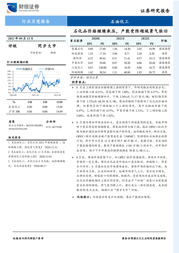 【财信证券】【20210913】石油化工行业月度报告:石化品价格继续承压,产能受限领域景气依旧-11页