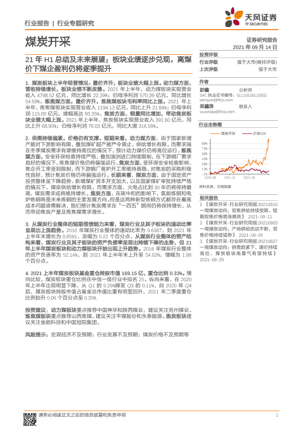 【天风证券】【20210914】20210914-天风证券-煤炭开采行业专题研究:21年H1总结及未来展望:板块业绩逐步兑现,高煤价下煤企盈利仍将逐季提升-33页