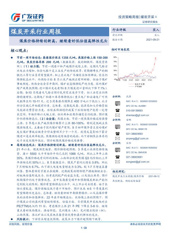 【广发证券】【20210921】20210921-广发证券-煤炭开采行业周报:煤焦价格持续创新高,继续看好低估值高弹性龙头-22页