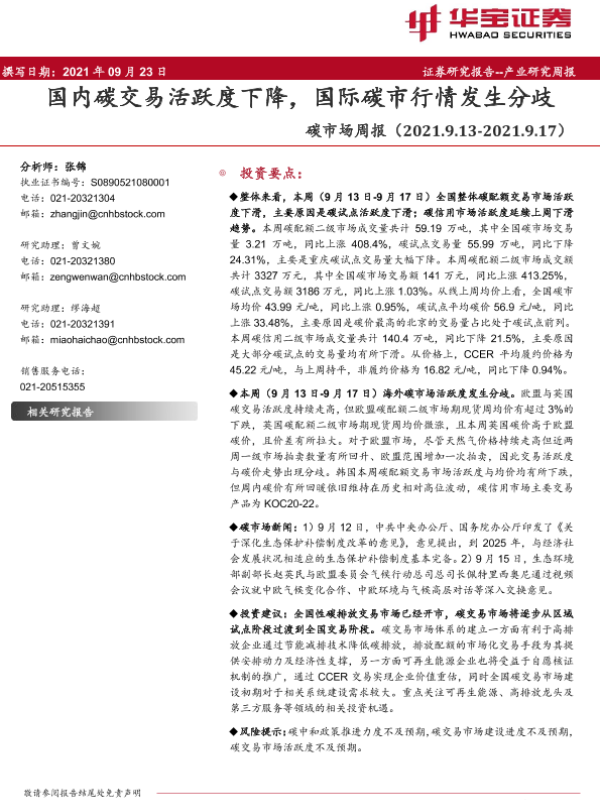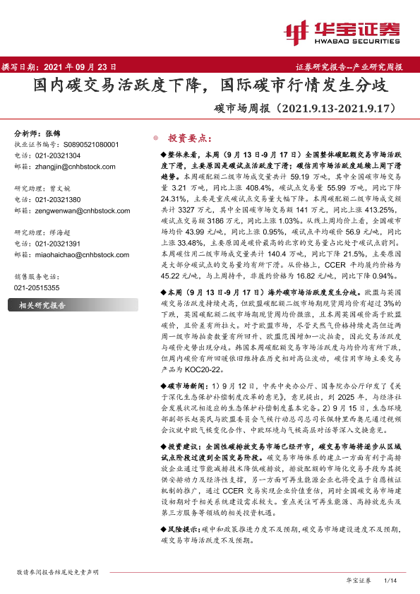 【华宝证券】【20210923】20210923-华宝证券-碳市场周报:国内碳交易活跃度下降,国际碳市行情发生分歧-14页
