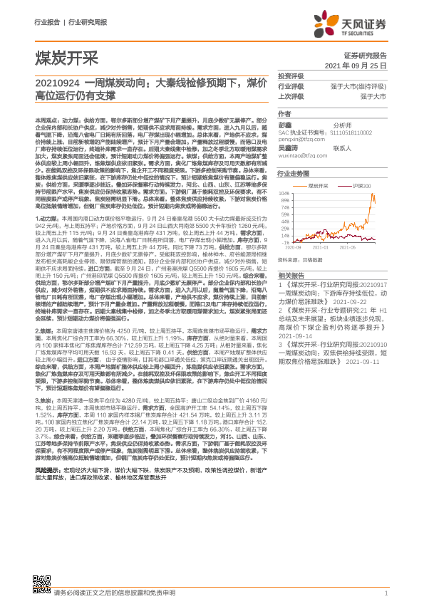 【天风证券】【20210925】20210925-天风证券-一周煤炭动向:大秦线检修预期下,煤价高位运行仍有支撑-19页