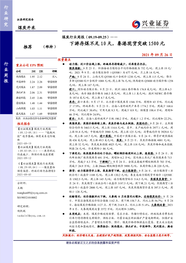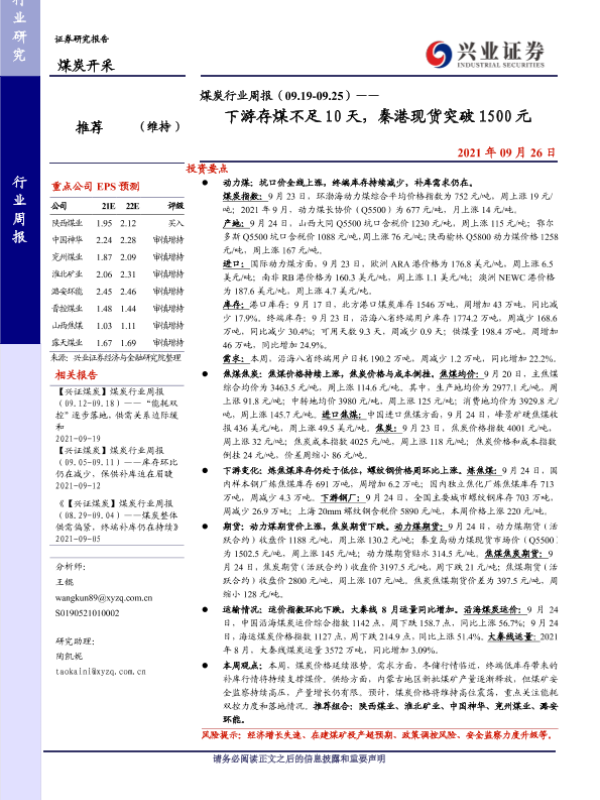 【兴业证券】【20210926】煤炭行业周报(09.19-09.25)——下游存煤不足10天,秦港现货突破1500元-10页