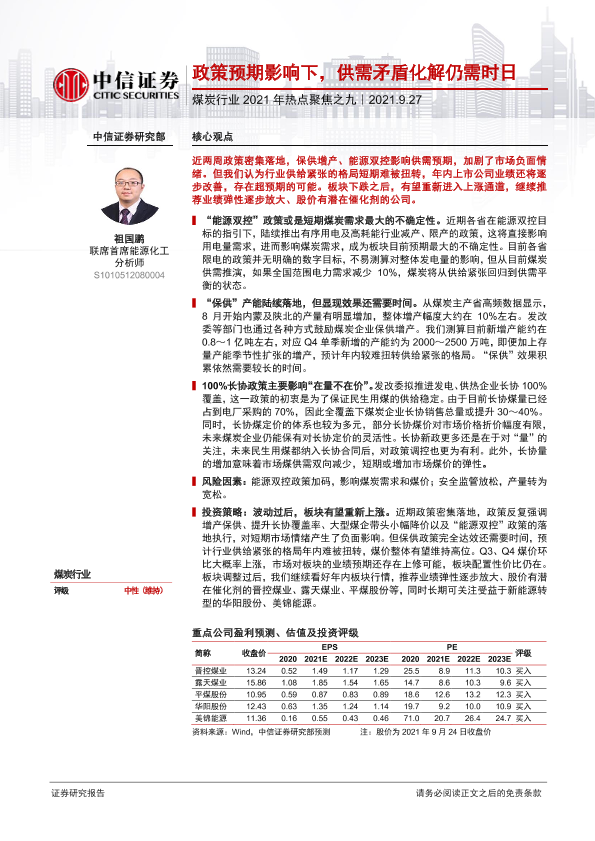 【中信证券】【20210927】煤炭行业2021年热点聚焦之九:政策预期影响下,供需矛盾化解仍需时日-13页