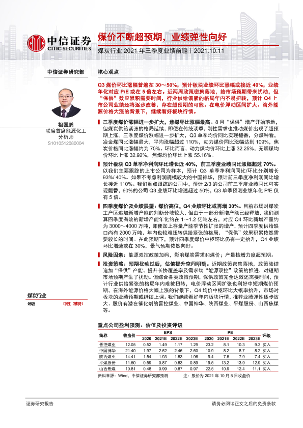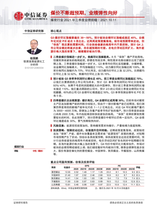 【中信证券】【20211011】煤炭行业2021年三季度业绩前瞻:煤价不断超预期,业绩弹性向好-14页