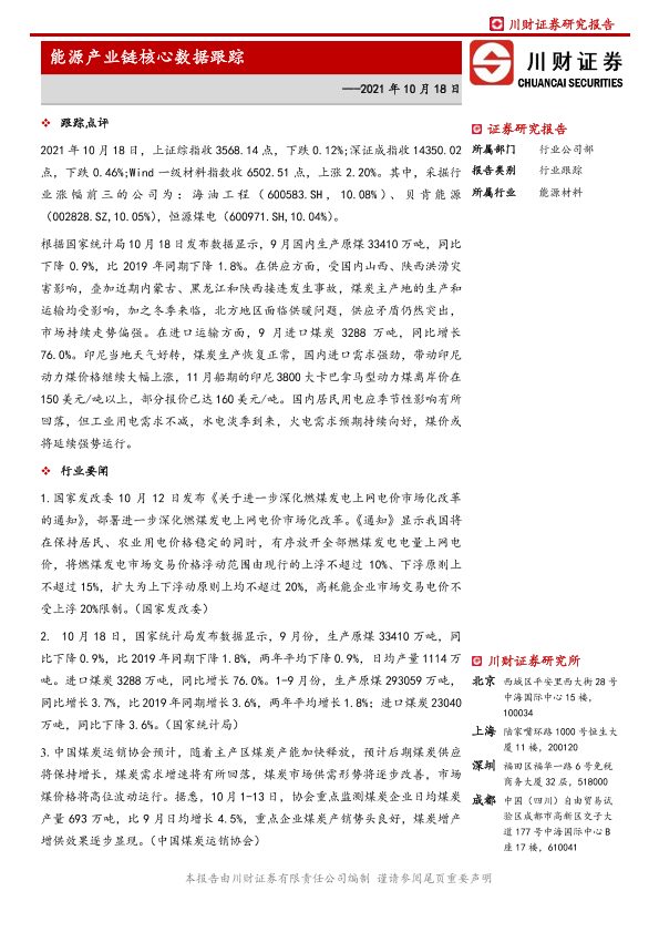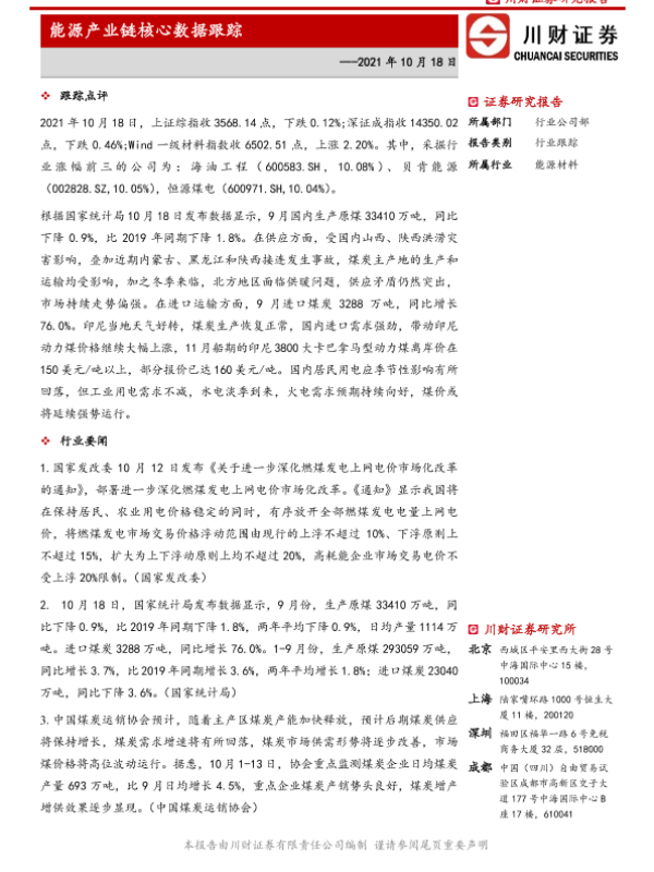 【川财证券】【20211018】能源产业链核心数据跟踪-6页