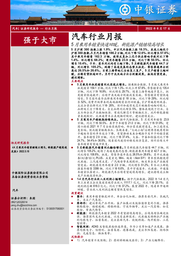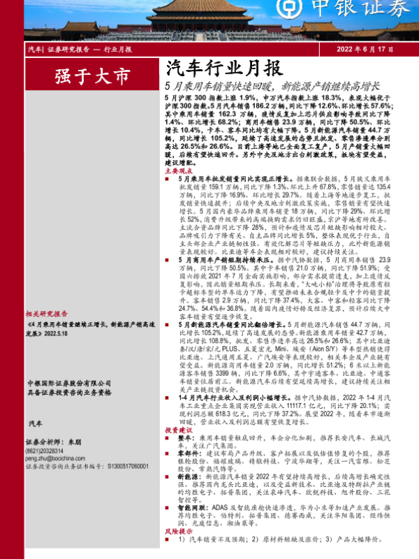 【中银证券】【20220617】汽车行业月报:5月乘用车销量快速回暖,新能源产销继续高增长-16页