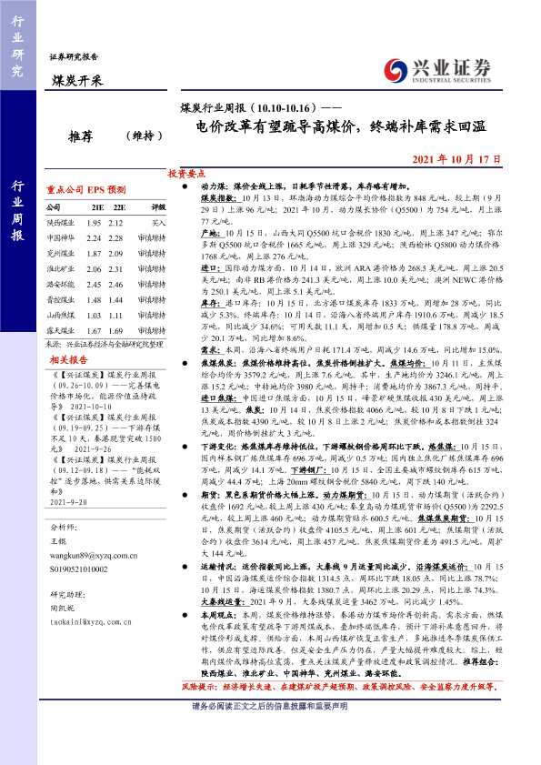 【兴业证券】【20211017】煤炭行业周报(10.10-10.16)——电价改革有望疏导高煤价,终端补库需求回温-10页