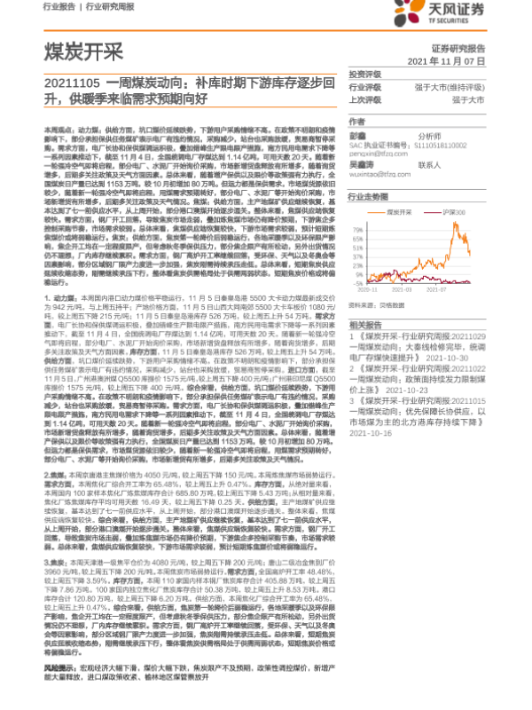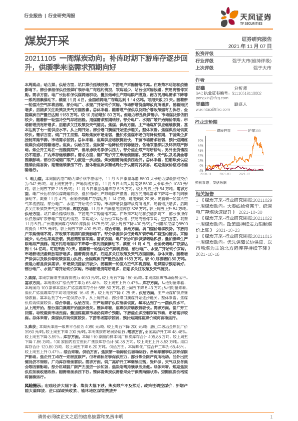 【天风证券】【20211107】20211107-天风证券-煤炭开采行业一周煤炭动向:补库时期下游库存逐步回升,供暖季来临需求预期向好-19页