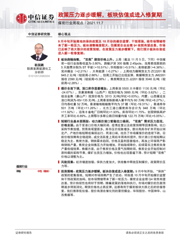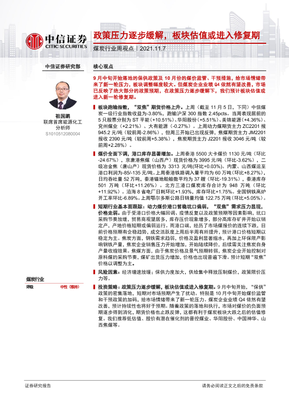 【中信证券】【20211107】20211107-中信证券-煤炭行业周观点:政策压力逐步缓解,板块估值或进入修复期-7页