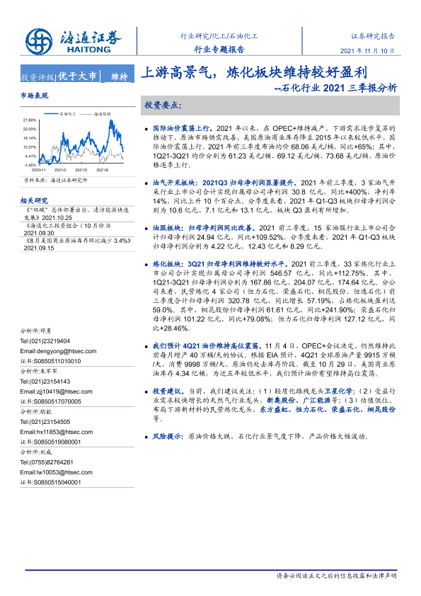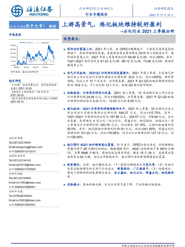 【海通证券】【20211110】石化行业2021三季报分析:上游高景气,炼化板块维持较好盈利-17页