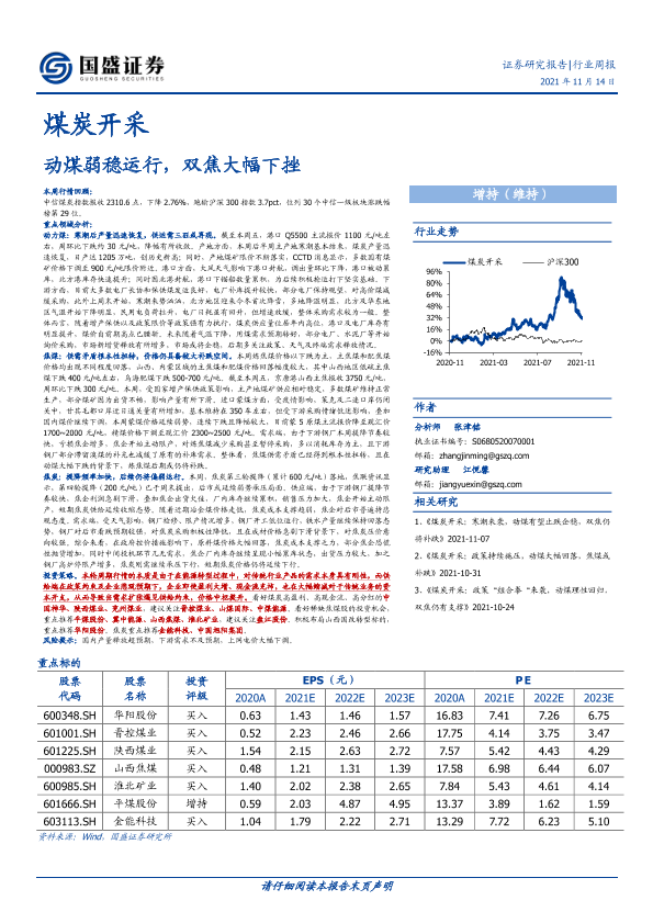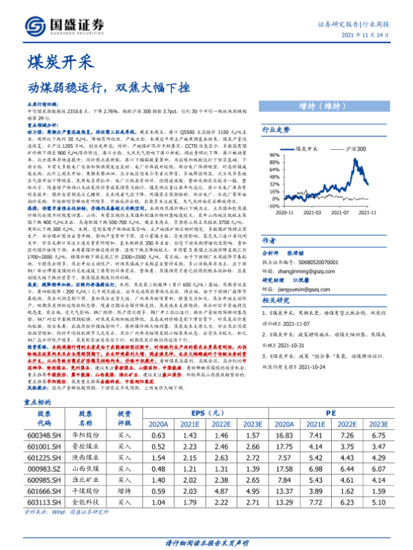 【国盛证券】【20211114】20211114-国盛证券-煤炭开采行业周报:动煤弱稳运行,双焦大幅下挫-18页