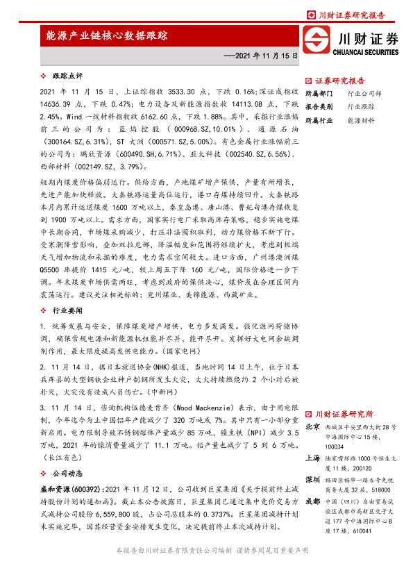 【川财证券】【20211115】能源产业链核心数据跟踪-5页