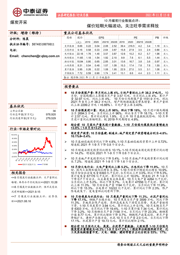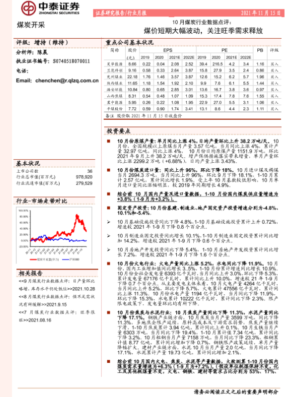 【中泰证券】【20211115】10月煤炭行业数据点评:煤价短期大幅波动,关注旺季需求释放-7页