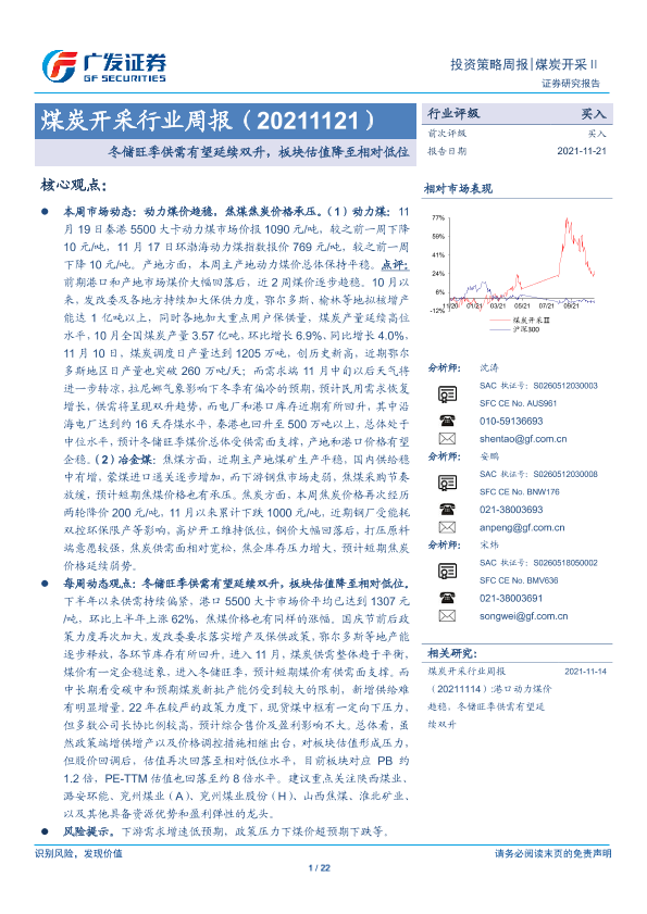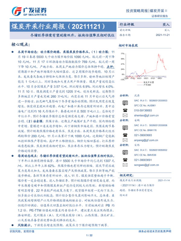 【广发证券】【20211121】20211121-广发证券-煤炭开采行业周报:冬储旺季供需有望延续双升,板块估值降至相对低位-22页
