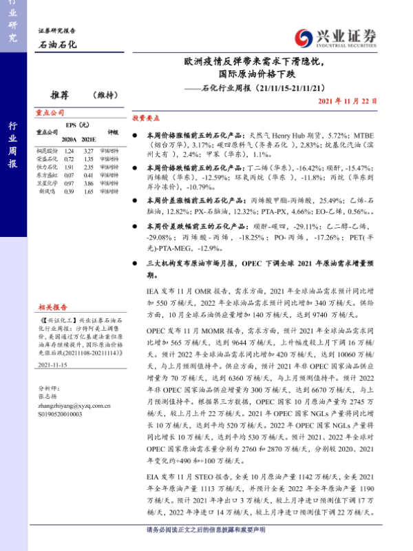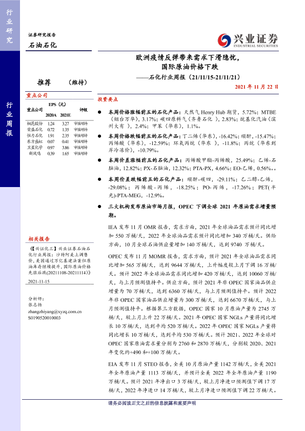 【兴业证券】【20211122】石化行业周报:欧洲疫情反弹带来需求下滑隐忧,国际原油价格下跌-15页