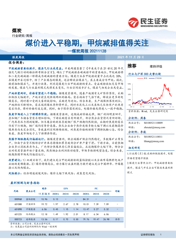 【民生证券】【20211129】20211129-民生证券-煤炭周报:煤价进入平稳期,甲烷减排值得关注-23页