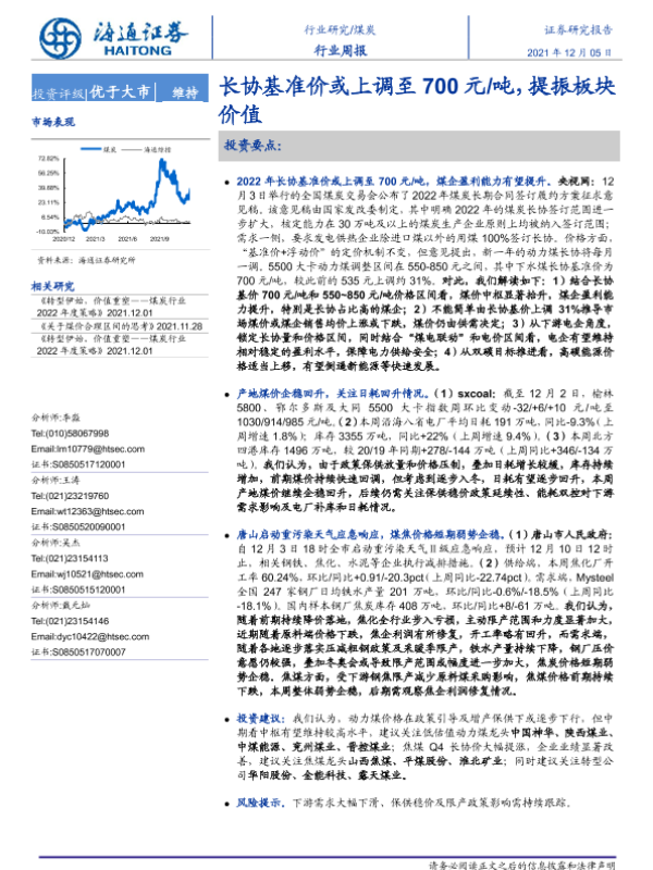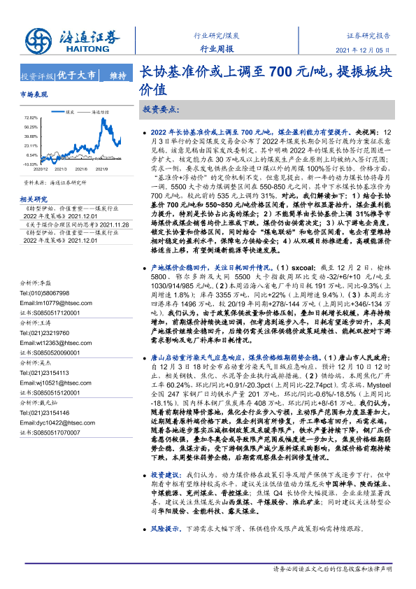 【海通证券】【20211205】20211205-海通证券-煤炭行业周报:长协基准价或上调至700元 吨,提振板块价值-2页