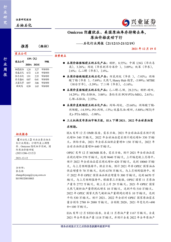 【兴业证券】【20211219】石化行业周报:Omicron阴霾犹在、美国原油库存持续去库,原油价格波动下行-16页