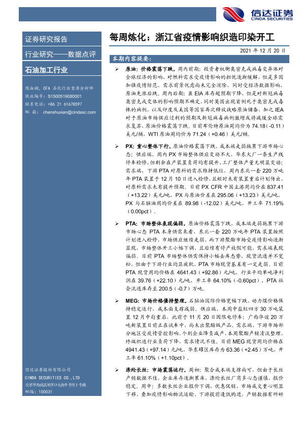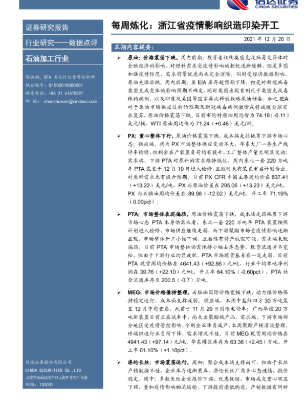 【信达证券】【20211220】每周炼化:浙江省疫情影响织造印染开工-9页
