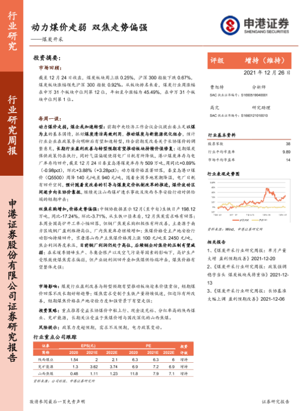 【申港证券】【20211226】煤炭开采:动力煤价走弱 双焦走势偏强-5页