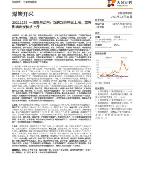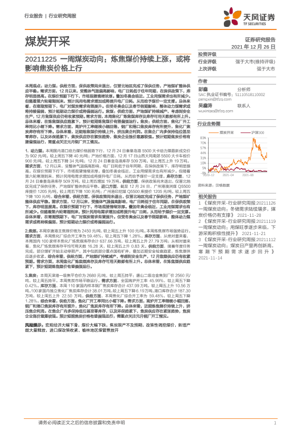 【天风证券】【20211226】20211226-天风证券-一周煤炭动向:炼焦煤价持续上涨,或将影响焦炭价格上行-19页