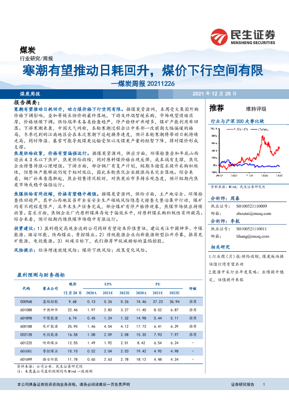 【民生证券】【20211226】寒潮有望推动日耗回升,煤价下行空间有限——煤炭周报 20211226-22页