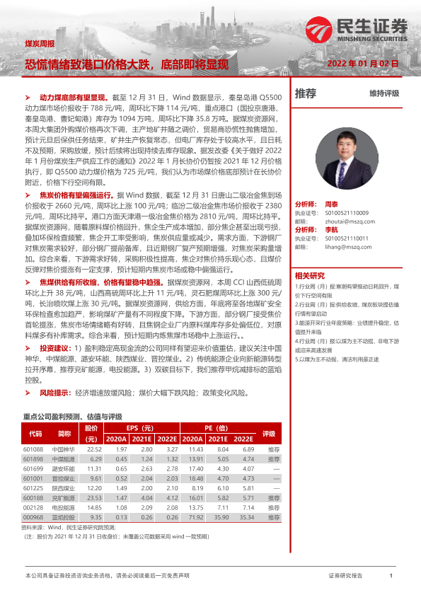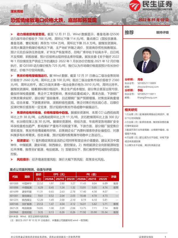【民生证券】【20220102】20220102-民生证券-煤炭周报:恐慌情绪致港口价格大跌,底部即将显现-21页
