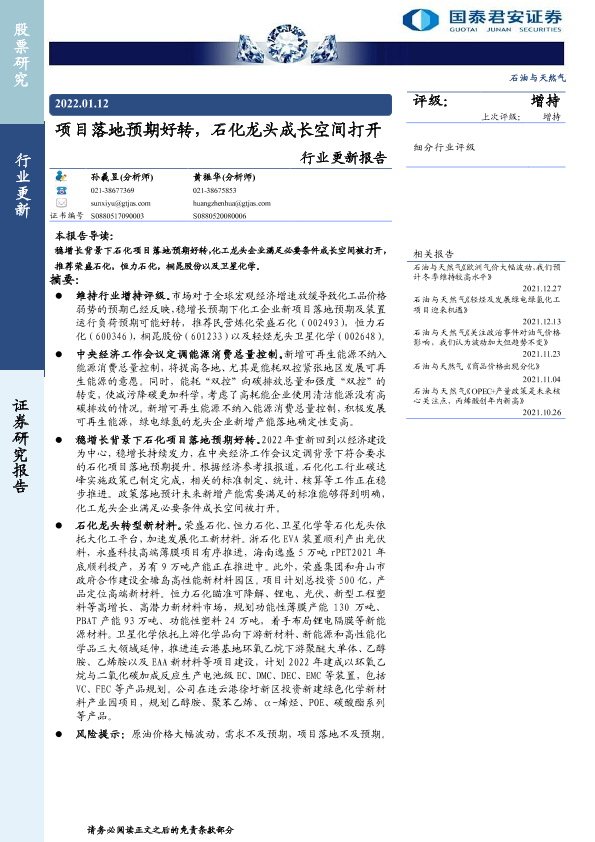 【国泰君安证券】【20220112】20220112-国泰君安-石油与天然气行业更新报告:项目落地预期好转,石化龙头成长空间打开-4页