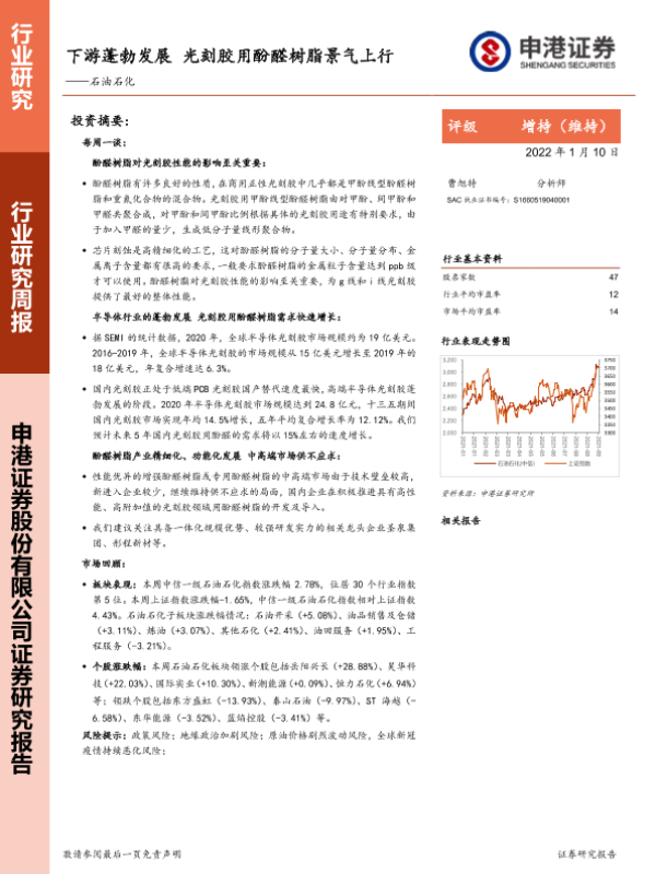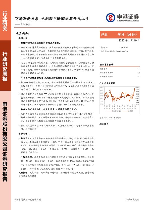 【申港证券】【20220110】20220110-申港证券-石油石化行业研究周报:下游蓬勃发展 光刻胶用酚醛树脂景气上行-20页