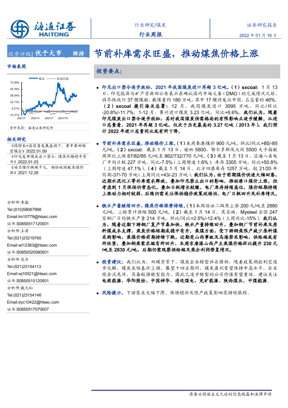 【海通证券】【20220116】煤炭行业周报:节前补库需求旺盛,推动煤焦价格上涨-2页