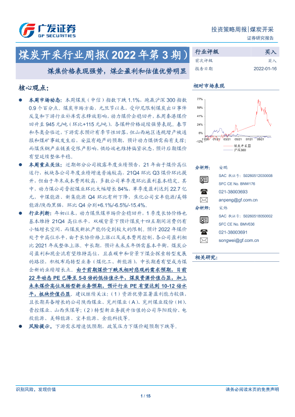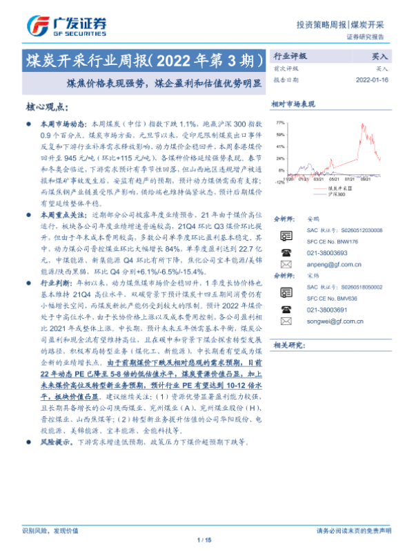 【广发证券】【20220116】煤炭开采行业周报(2022年第3期):煤焦价格表现强势,煤企盈利和估值优势明显-15页