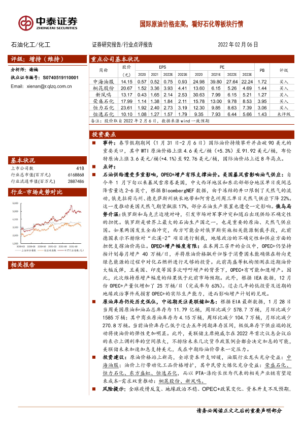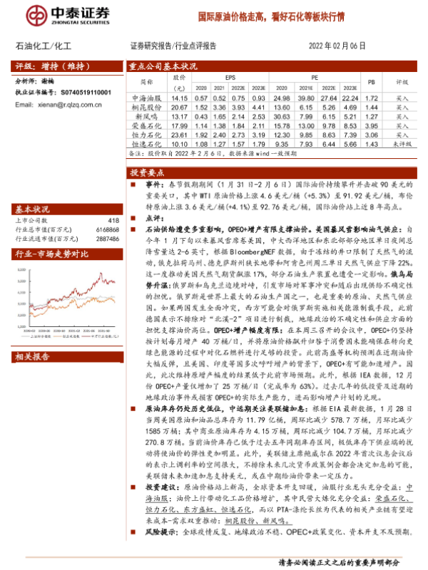 【中泰证券】【20220206】20220206-中泰证券-石油化工:国际原油价格走高,看好石化等板块行情-2页
