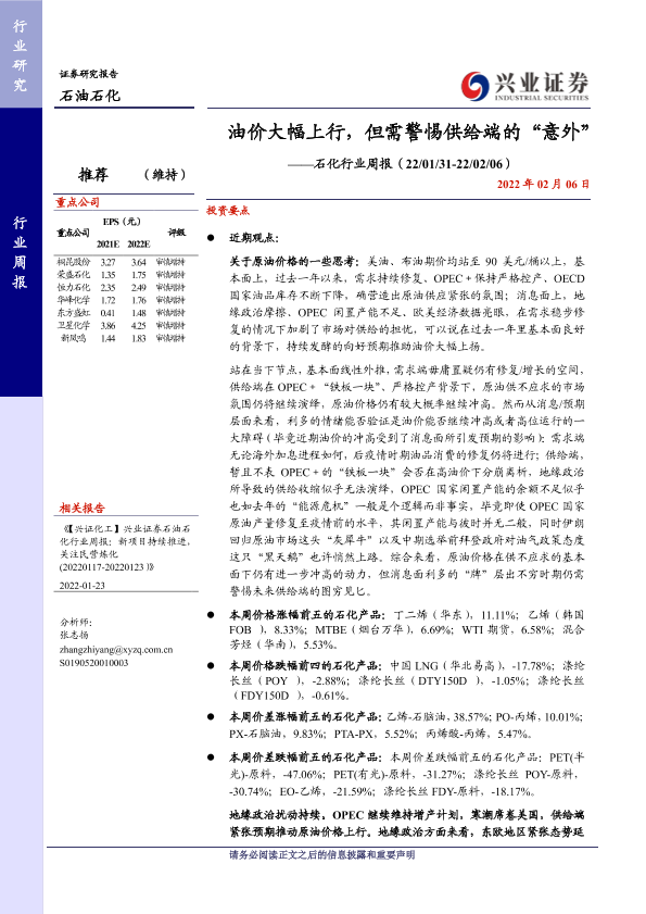 【兴业证券】【20220206】20220206-兴业证券-石化行业周报:油价大幅上行,但需警惕供给端的“意外”-16页