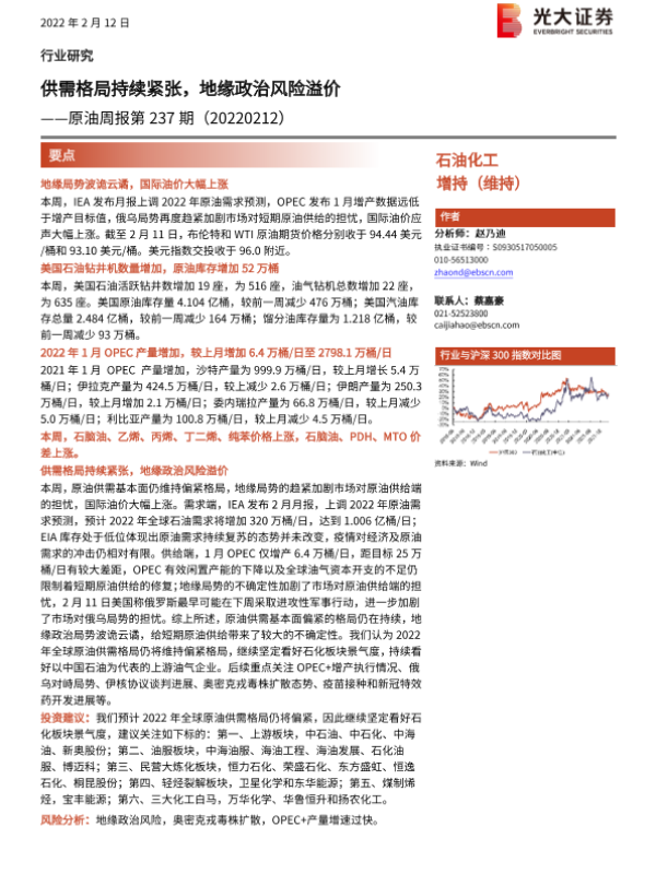 【光大证券】【20220212】20220212-光大证券-原油周报第237期:供需格局持续紧张,地缘政治风险溢价-11页