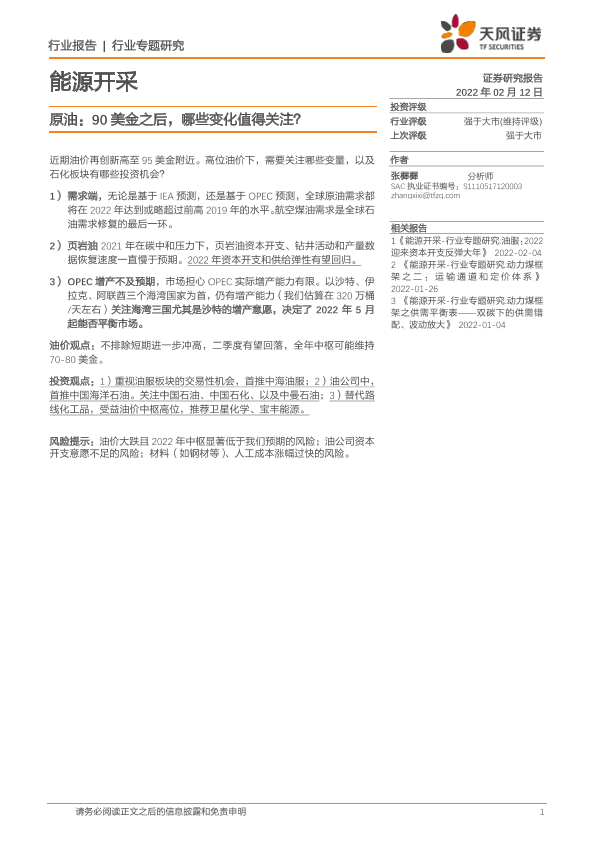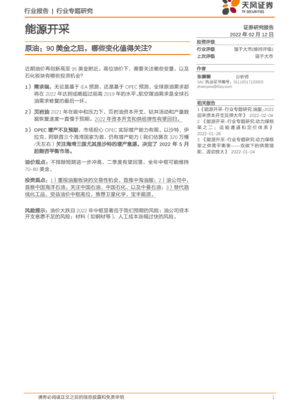 【天风证券】【20220212】能源开采行业专题研究:原油:90美金之后,哪些变化值得关注?-7页